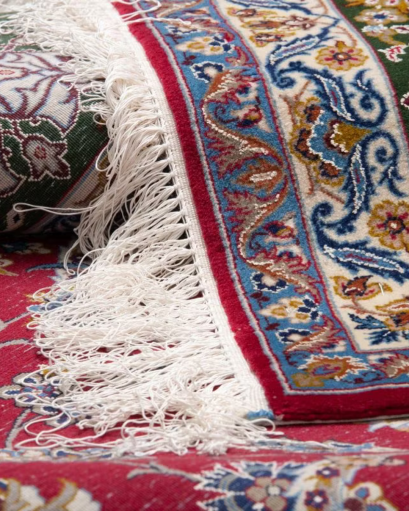 Il restauro comprende la riparazione di danni come bordi e frange danneggiati, ricostruzione del vello e interventi su aree logorate, ripristinando l’aspetto originale del tappeto senza compromettere la sua struttura.
