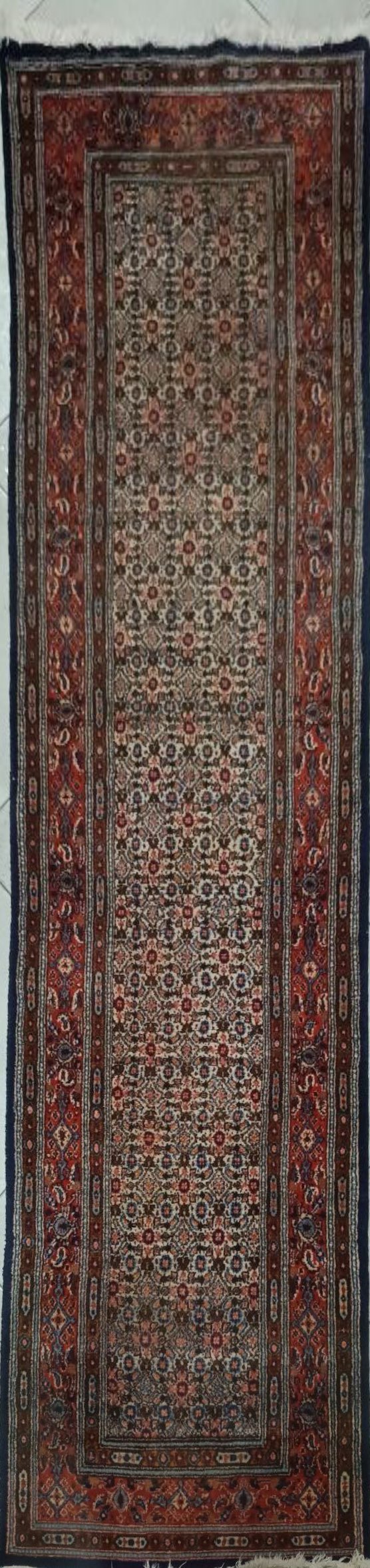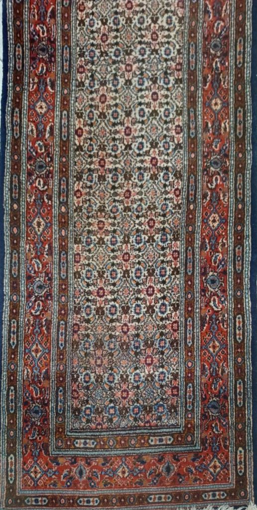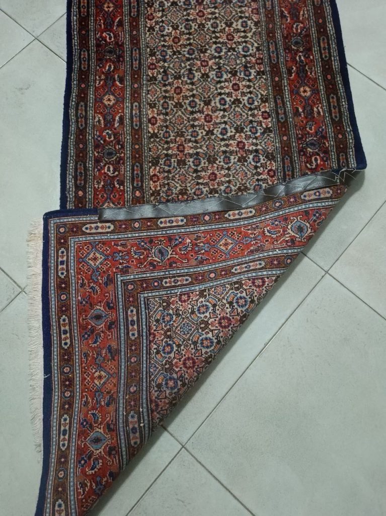 Tappeto Mood (Moud) Iran misura 278×76 cm, realizzato in lana su cotone con raffinato disegno floreale su fondo avorio e bordure rosso/blu. Passatoia persiana elegante e resistente, ideale per corridoi e ingressi. Alta qualità artigianale iraniana.
